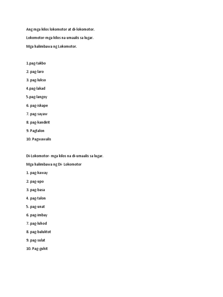 Halimbawa ng kilos lokomotor ay pagtakbo at halimbawa ng kilos di lokomotor ay pagtalon. Natututukoy ang mga kilos lokomotor. Contextual translation of lokomotor into english. Kinder to grade 3 grade level: Found worksheet you are looking for?